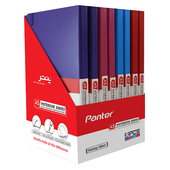 دفتر پنتر سایز A5 در 7 رنگ جلد آبی، قرمز، صورتی، بنفش، مشکی، سرمهای و طوسی طراحی و تولید شده است.