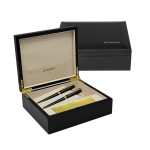 قلم ها داخل جعبه چوبی نفیسی بسته بندی شده اند بطوری که نماد های ترازو و چکش بالاتر از بقیه قطعات قلم بتواند خودنمایی کند.
