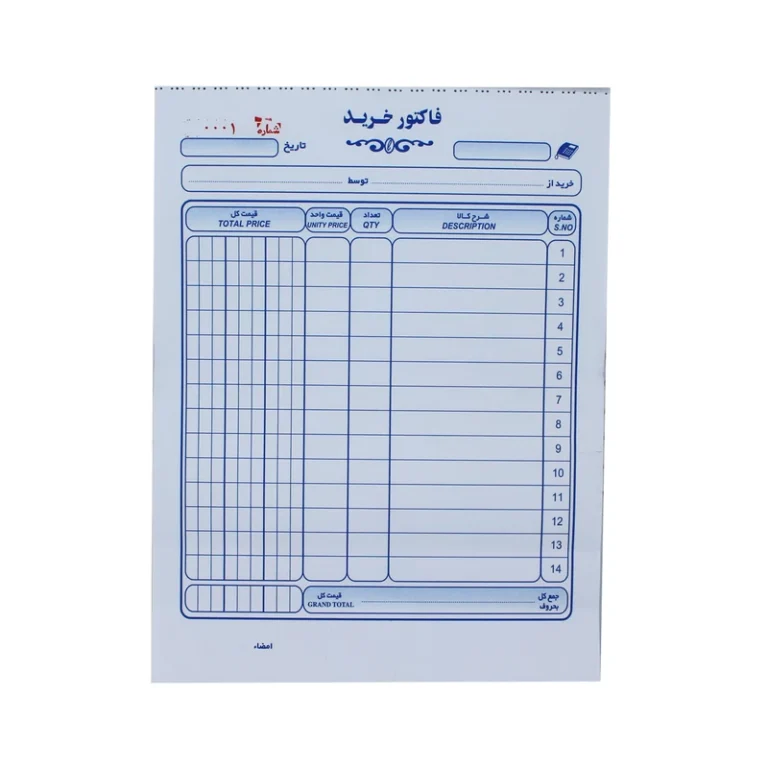 می باشد همچنین جنس جلد فاکتور فروش، جلد کاغذی بوده و همچنین این فاکتور فروش بدون کاربن